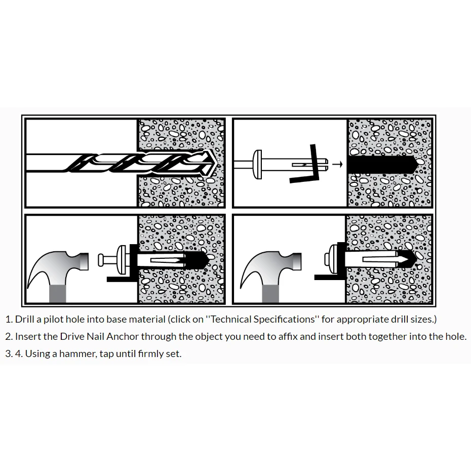 Made of a corrosion resistant zamac alloy these hammer drive anchors are ideal for medium duty applications into concrete, brick or block. Similar to the expansion anchor, the hammer drive utilizes its design to spread the weight of the fixture allowing it to hold secure in most applications. This anchor is commonly used for permanent applications into masonry surfaces. With medium load capacity these anchors are perfect for securing drywall tracks, gutters to the side of buildings and brackets into concrete.