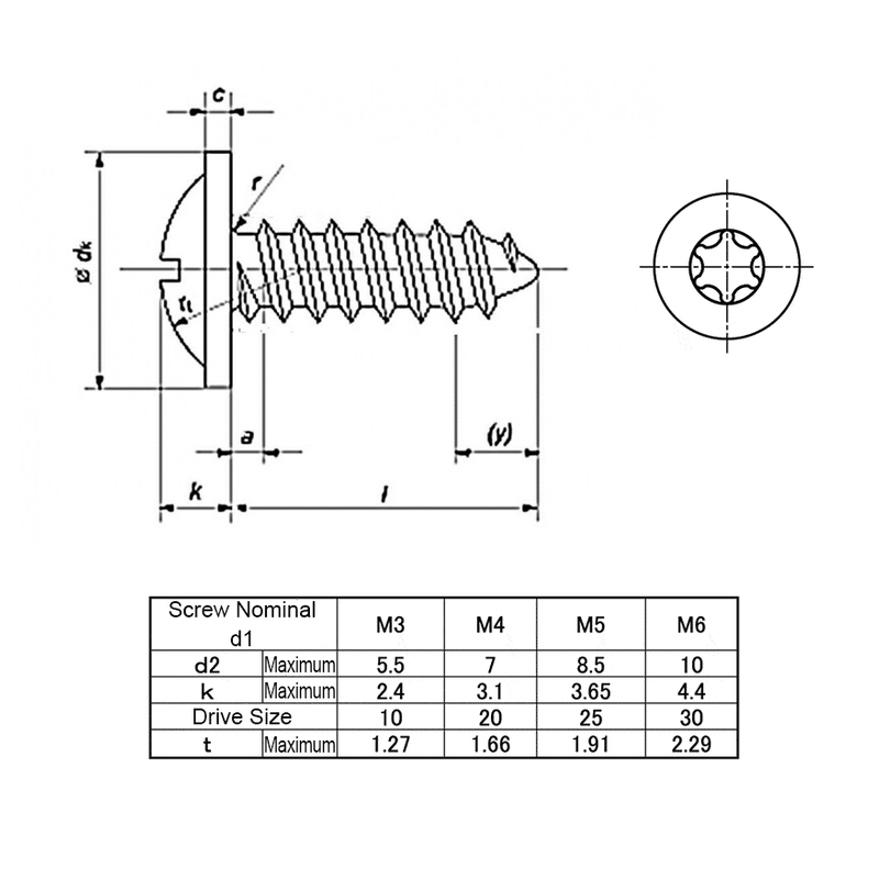 The threads taper down to the point, allowing the screw to form threads into the material as the screw is installed. Torx modified truss head screws have an oversized, flanged head